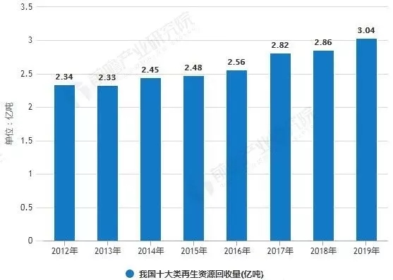 統(tǒng)計(jì)數(shù)據(jù)顯示,2012年我國(guó)再生資源回收量已達(dá)2.34萬億噸,到了2016年我國(guó)再生資源回收量超2.5億噸。