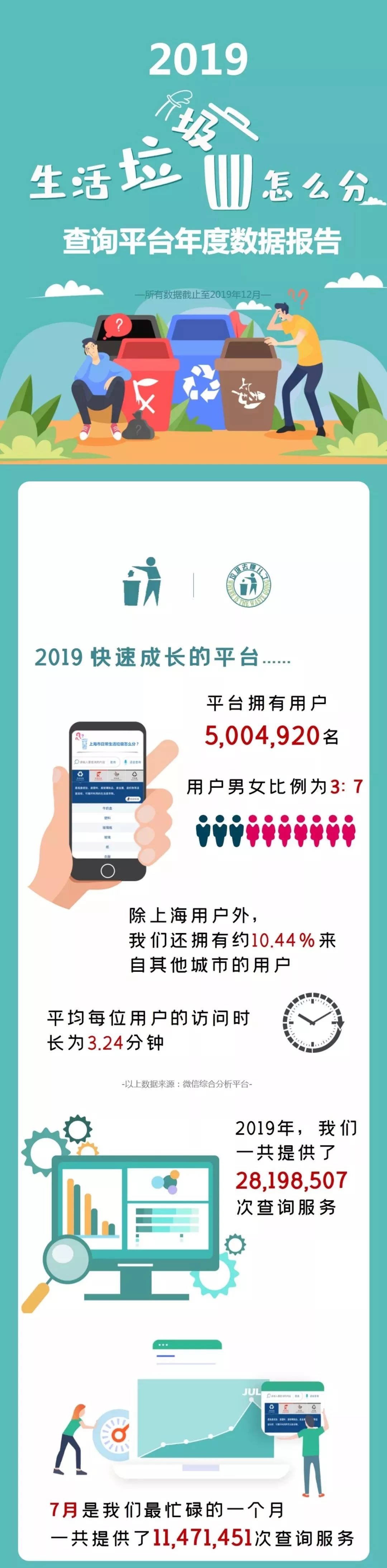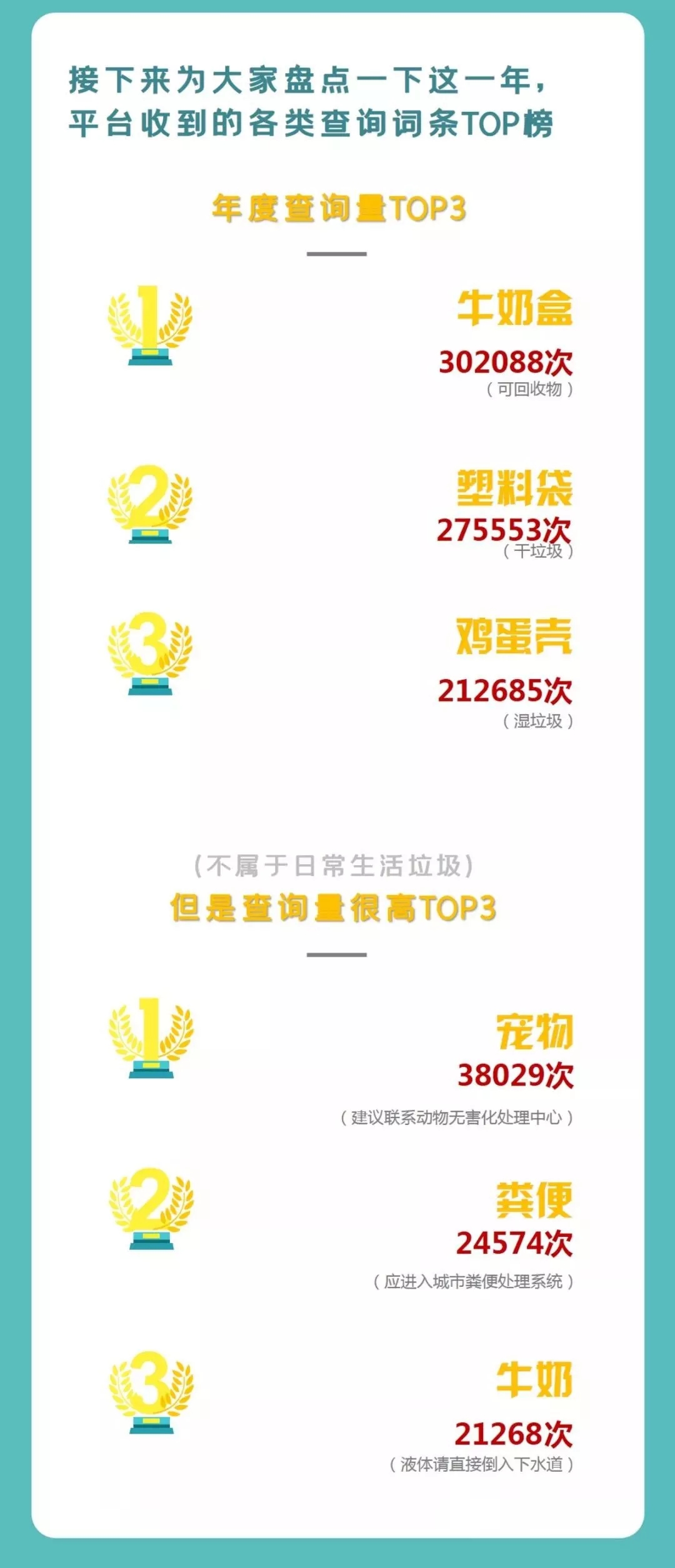 市綠化市容局說,自2019年7月1日《上海市生活垃圾管理?xiàng)l例》實(shí)施以來,使用“上海發(fā)布”市政大廳“垃圾分類查詢”功能和“垃圾分類查詢小程序”的用戶已超500萬名,平均每位用戶訪問時(shí)長(zhǎng)為3.24分鐘。在各類查詢?cè)~條中,年度查詢量前三的生活垃圾分別為牛奶盒、塑料袋和雞蛋殼。詳見↓