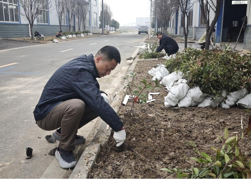 華中園區(qū)樹枝修剪活動(dòng)進(jìn)行的同時(shí),谷城園區(qū)2號廠房旁的空地上,一場植樹行動(dòng)也在熱火朝天地展開。上午9時(shí),園區(qū)執(zhí)行董事胡濱在啟動(dòng)儀式上發(fā)表講話,強(qiáng)調(diào)植樹造林的重要性,并號召員工為綠色家園貢獻(xiàn)力量。400余平方米的綠化帶上,數(shù)名員工化身“綠色工匠”:客服部提前松土“打樣”;各部門領(lǐng)導(dǎo)身先士卒,帶頭種樹,員工們分散在指定區(qū)域,有條不紊地進(jìn)行植樹工作……盡管部分員工是首次參與植樹行動(dòng),但在大家融洽的配合中,連揮鍬鏟土的動(dòng)作都逐漸默契。歷經(jīng)奮戰(zhàn),21000余棵樹苗被整齊且鄭重地種下,綠化面積達(dá)1000余平方米。